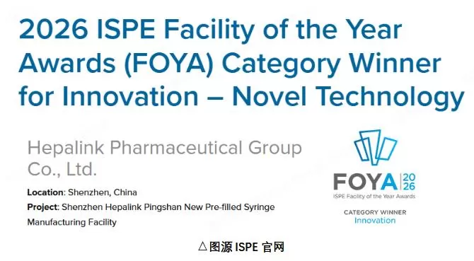 4月20日,国际制药工程协会(ISPE)公布了2026年度设施奖(FOYA,Facility of the Year Awards),来自全球医药企业的10个医药设施获奖。作为被誉为“医药设施奥斯卡”的国际权威奖项,FOYA代表着全球制药工程与医药制造领域的高水平专业认可。海普瑞药业坪山新建预灌封制剂智造项目凭借在高黏度制剂产品制造领域的突破性创新,斩获“创新-新技术”类别大奖,是本届获奖的唯一中国企业,也是FOYA设立的20多年中,中国药企在境内建设的医药制造设施中唯一获此殊荣的项目,这意味着中国医药高端制造首次在全球最严苛标准中实现领跑。赛诺菲、拜耳、礼来、阿斯利康、武田等国际顶尖医药企业亦位列本届榜单。