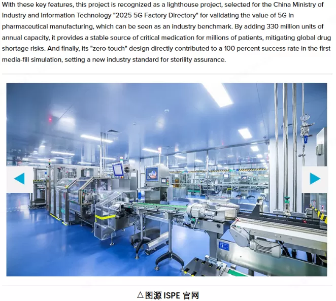 凭借上述技术集成能力,该基地成功入选中国工信部《2025年5G工厂名录》,成为验证5G技术在医药制造领域价值的灯塔项目。其“零接触”设计实现首次培养基模拟灌装100%成功率,为无菌保障树立了新的行业标准;新增3.3亿支年产能后,可为全球数百万患者提供关键药物的稳定来源,并有助于降低全球药品短缺风险,彰显中国智造守护人类健康的责任与担当。